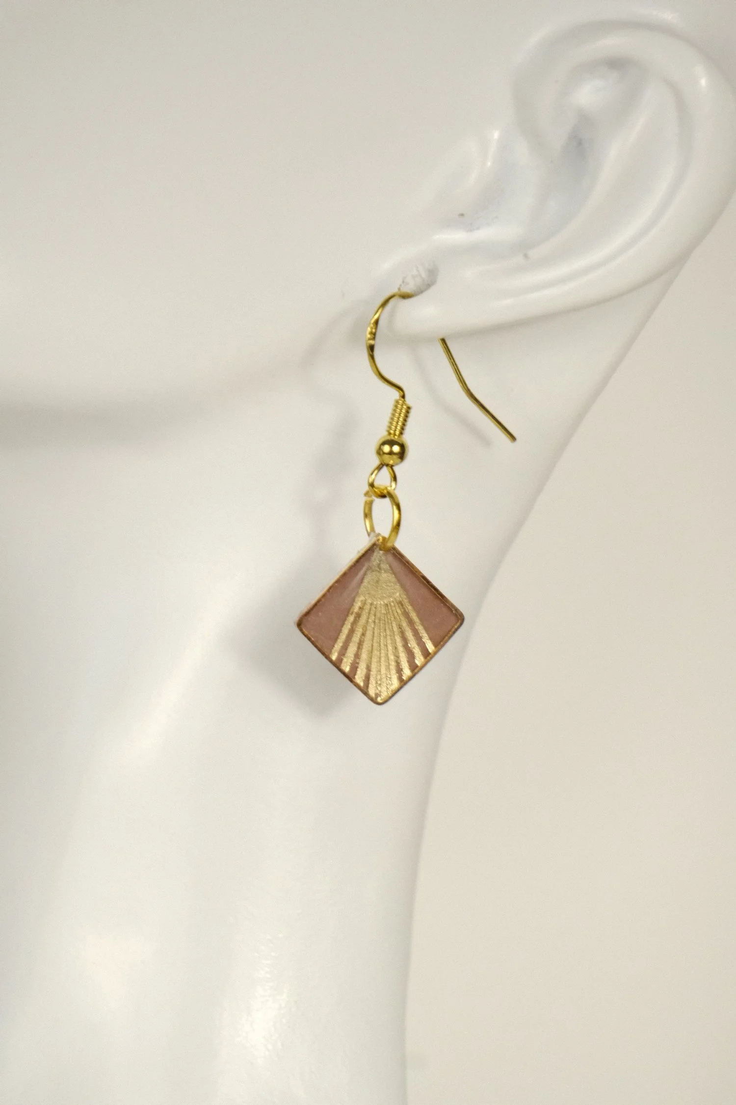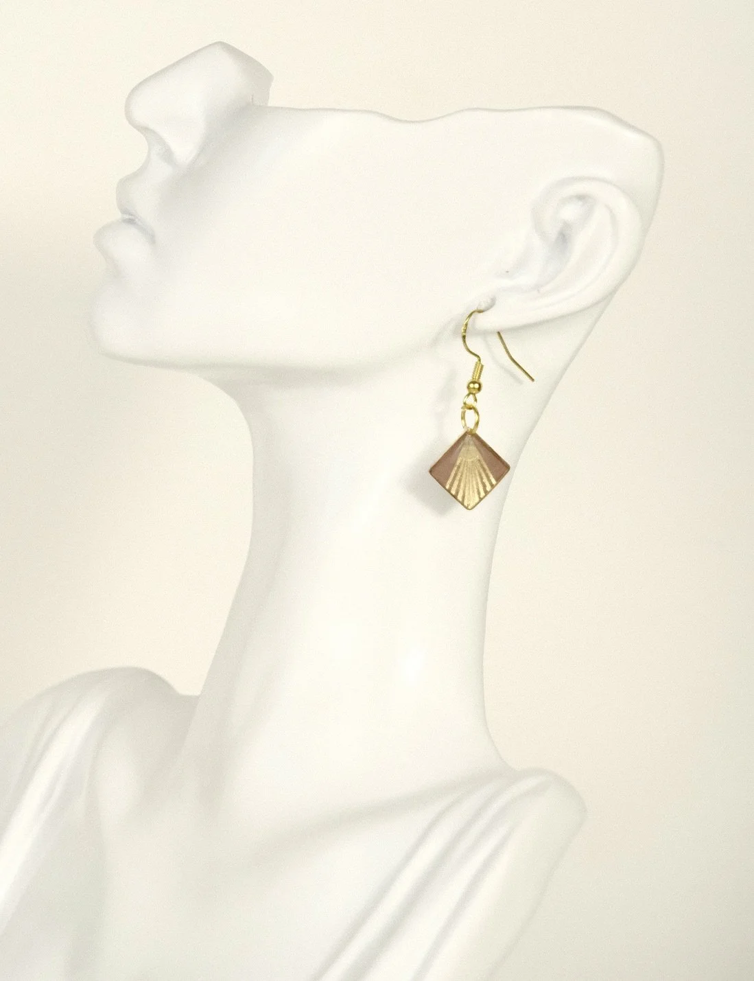 This hand made pair of earrings feature Polka dots set onto a beige backdrop, divided by a band of golden leaves. These earring have used a piece of discarded paper and turned it into an item of beauty, an item of wearable art. They are light weight and comfortable to wear and are totally unique in design.