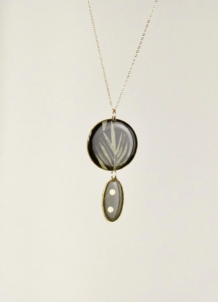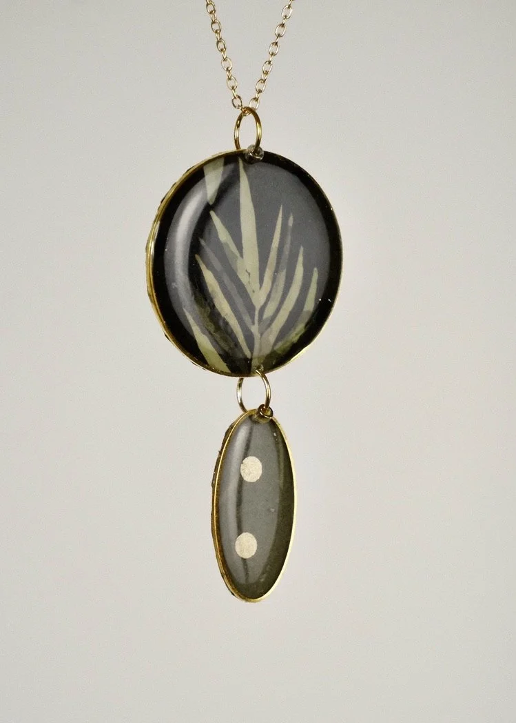 This delicate double square pendant features recycled paper set into resin, surrounded by a larger square. The emerald inlay swirls and slightly sparkles when catching the light. It is attached to a small dragons eye natural stone which picks up the colour leading the eye upwards.